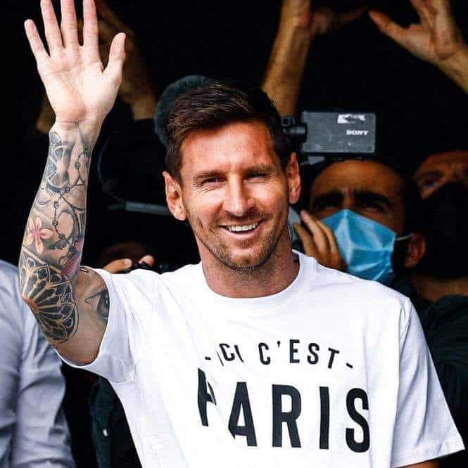 Vestindo uma camiseta com a frase “Aqui é Paris”, em francês, Messi sorriu e acenou para muitos fãs que foram recebê-lo no aeroporto de Le Bourget, nos arredores da capital francesa, após seu voo de Barcelona. Cantando “Messi, Messi, Messi”, os fãs aplaudiram e soltaram fogos de artifício.