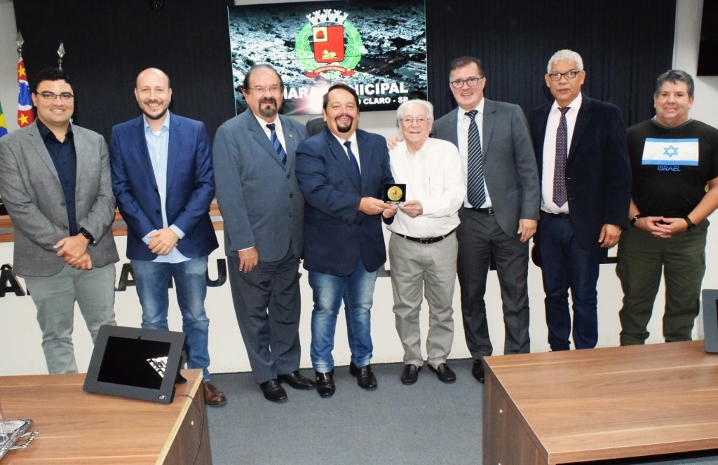 A Câmara Municipal realizou a entrega da Medalha de Honra ao Mérito a Ruy Pignataro Fina na noite de terça-feira, 10/10, pelos relevantes trabalhos prestados à comunidade de Rio Claro ao longo dos seus 90 anos de vida. O Decreto Legislativo 679/2023, que possibilitou a homenagem é de autoria do vereador Hernani Leonhardt (MDB) que presidiu a solenidade ao lado do prefeito Gustavo Perissinotto.