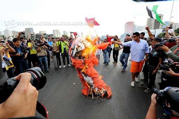 Perto de 100 manifestantes, de acordo com a Polícia Militar (PM) do Distrito Federal, atearam fogo a uma réplica da Taça da Fifa há pouco, a cerca de 2 quilômetros do Estádio Nacional de Brasília/Mané Garrincha, onde a seleção brasileira enfrenta às 17h de hoje (23) a seleção de Camarões, pela terceira rodada do Mundial.