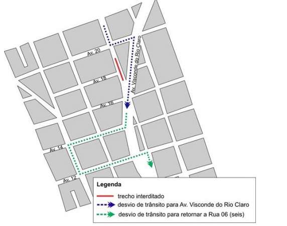 O serviço terá início às oito horas da manhã e tem a previsão de ser concluído até ao meio dia. Durante o período de manutenção, a Rua 6 (seis) será interditada e os motoristas que seguem pela via encontrarão desvio pela Avenida 20 (vinte) para acessar a Avenida Visconde do Rio Claro e utilizar a Avenida 14 (quatorze), a Rua 8 (oito) e a Avenida 12 (doze) para retornar ao trajeto inicial.