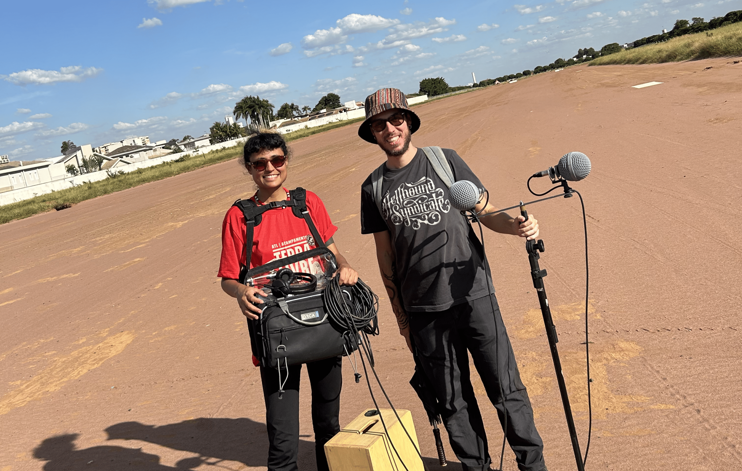 Isadora Maria Torres e Léo Bortolin gravando no campo de aviação