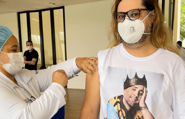 SÃO PAULO, SP (FOLHAPRESS) – Marcus Majella, 42, usou uma camiseta com a foto do amigo Paulo Gustavo, morto no último dia 4 por complicações com a Covid-19, para receber a vacina contra a doença nesta quarta-feira (19) no Rio de Janeiro. Os dois humoristas eram muito amigos.