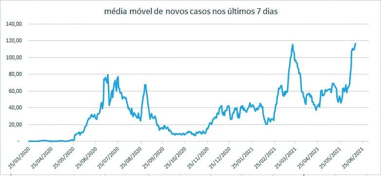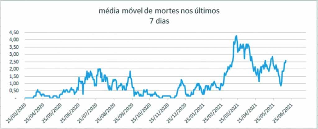 Já no sábado (19), a média móvel de mortes chegou a 3 e no domingo (20) e na segunda (21) permaneceu em 3,14. Até o dia 21 de junho, 490 óbitos foram registrados. Do dia 1º ao dia 21 deste mês, 43 óbitos foram registrados. Em maio, mês em que o total de mortes foi de 70, nesse mesmo período, a cidade registrou 46 óbitos.