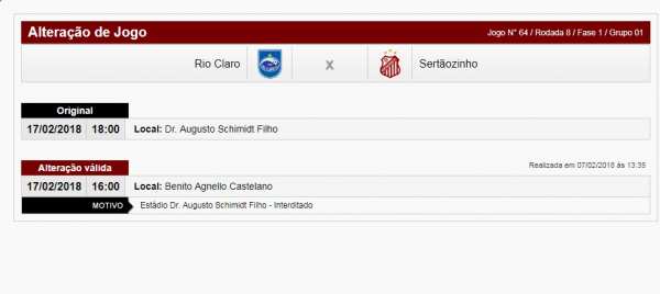 A partida entre Rio Claro e Sertãozinho válida pelo Paulista da série A-2 marcada para o próximo dia 17 de fevereiro, as 18h00 foi alterada pela Federação Paulista de Futebol para o estádio Benito Agnelo Castellano no mesmo dia, mas as 16h00.