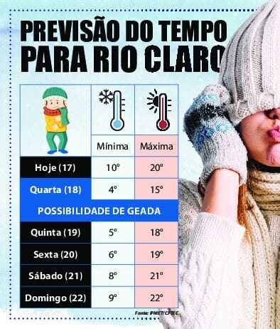 De acordo com as previsões da Coordenadoria Estadual de Proteção e Defesa Civil, a temperatura mínima em Rio Claro nesta terça-feira (17) deverá ser de 9 graus e chegar a 4 graus na quarta, quinta e sexta-feira, dias em que o município poderá ter geadas. As temperaturas máximas nesses três dias serão de 16, 17 e 18 graus.