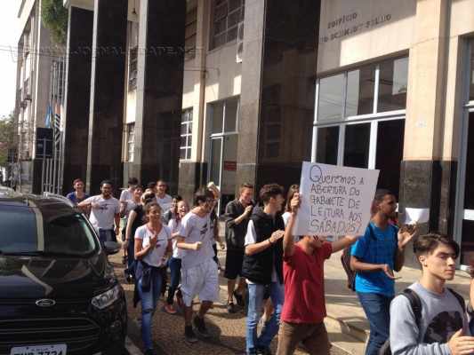 Os jovens, munidos de cartazes, foram ao Paço Municipal para reivindicar a reabertura do Gabinete de Leitura aos sábados e protocolaram um ofício à Prefeitura. A ação foi planejada pelos próprios estudantes junto com a professora Loni Lara Viegas, que elabora projetos de protagonismo social e juventude.