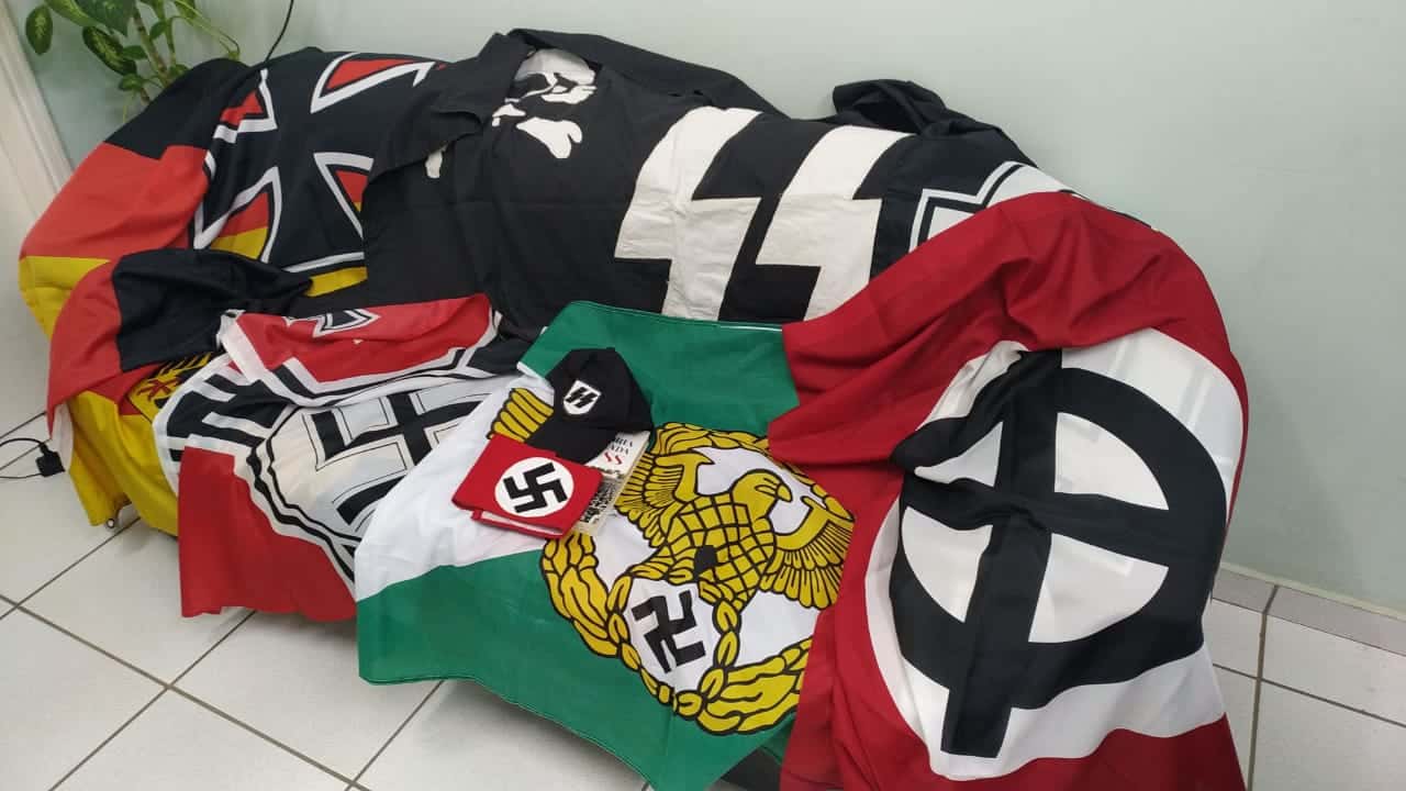 Diante de um mandado de busca, as autoridades localizaram no interior do imóvel várias outras bandeiras e artefatos ligados ao movimento criminoso, além de um exemplar do livro “A história revelada da SS”, que detalha a história do holocausto que vitimou milhões de judeus, ciganos, homossexuais e negros na Alemanha durante a Segunda Guerra Mundial.