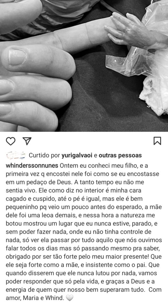 No domingo (30), Whinderson havia feito uma homenagem a João Miguel dizendo que “ontem eu conheci meu filho e a primeira vez que encostei nele foi como se eu encostasse em um pedaço de Deus”.