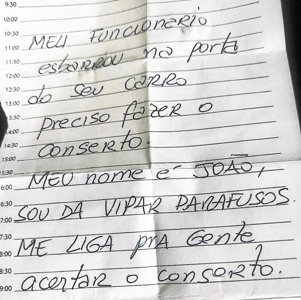 Enquanto Thais busca pela motorista que fugiu uma outra atitude vale a pena ser mencionada. O Jornal Cidade teve acesso a um bilhete deixado por um comerciante para o dono de um carro (foto abaixo). Após um incidente de amassar uma das portas, o autor não encontrando naquele momento o dono do veículo que estava estacionado escreveu um bilhete contando o acontecido, deixou o telefone e pediu que o proprietário entrasse em contato para combinar o conserto. O bilhete foi escrito por João Vigatto e quem recebeu foi o ex-prefeito Du Altimari que enalteceu a atitude e a honestidade do autor.