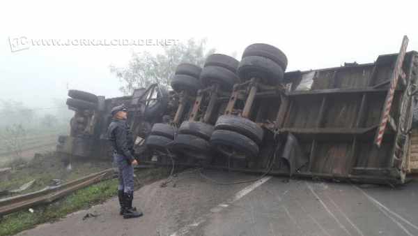 A ação fez com que o caminhão atravessasse o canteiro central e tombasse no outro lado da rodovia. O motorista teria afirmado que a neblina estava muito densa, além de a pista estar suja de barro, dificultando a visualização da sinalização da rodovia no solo.