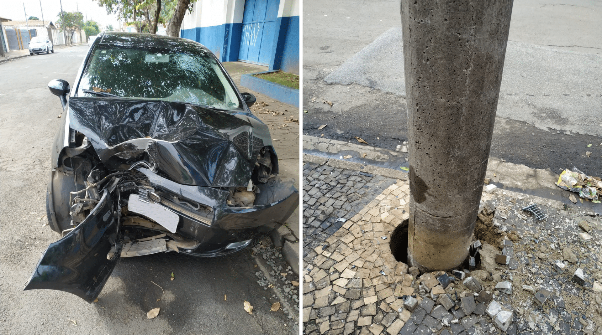Fotos tiradas por testemunhas após o acidente mostram que tanto o carro quanto o poste ficaram danificados.