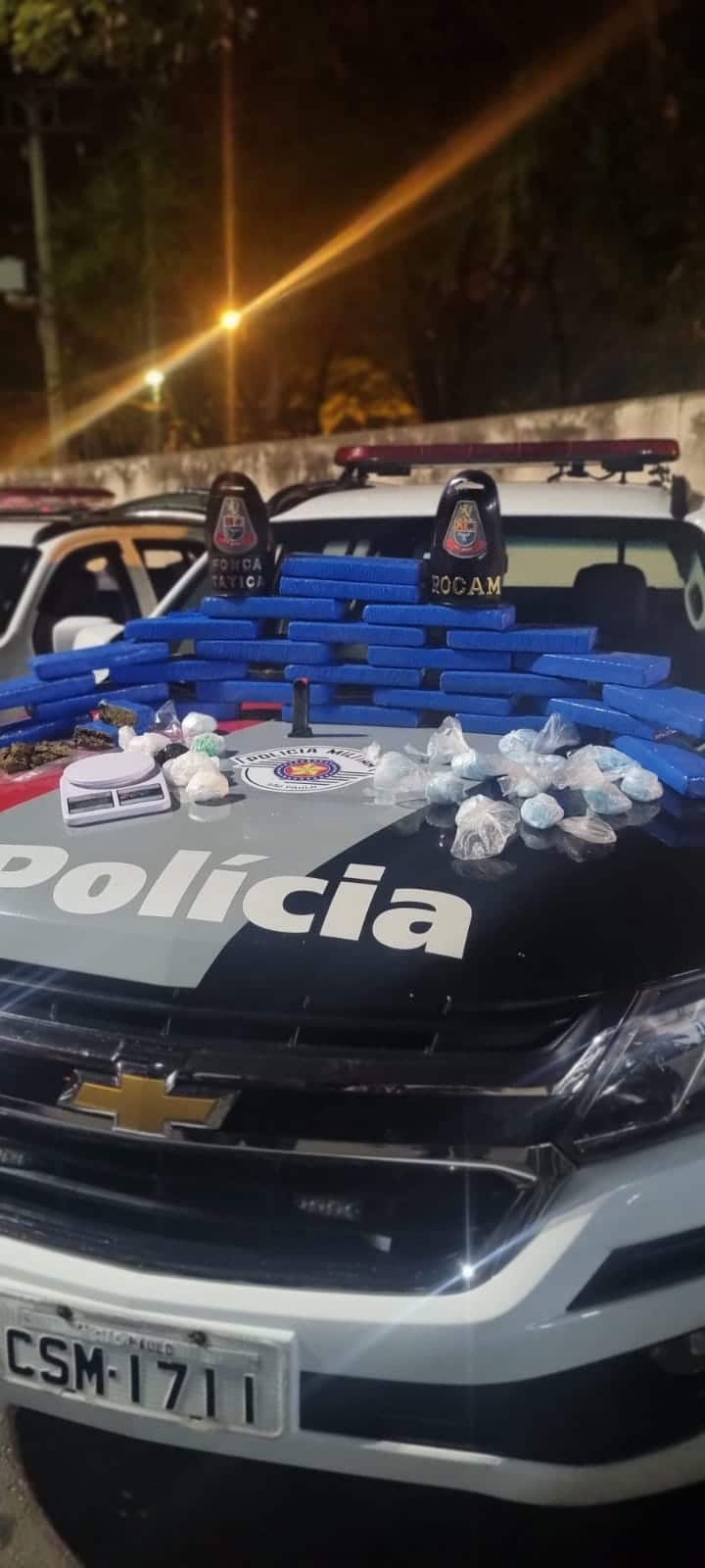 Na sequência, a equipe indagou a mulher sobre as drogas e esta informou que havia recebido de uma homem uma mala, porém não sabia do que se tratava. Diante dos fatos, ela autorizou a diligência pelo local e as equipes tiveram sucesso na localização de 25 tijolos de maconha, 385 microtubos de cocaína e uma balança de precisão que estavam no interior da mala.