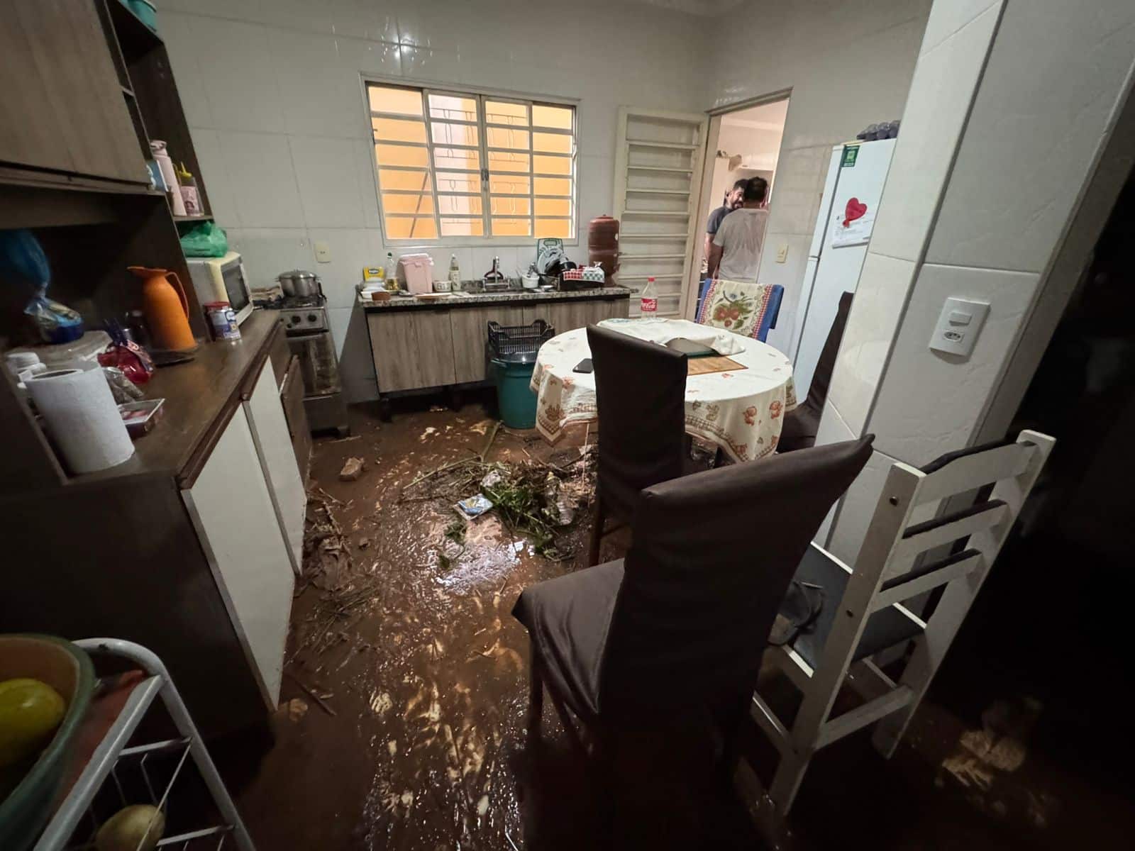 A estiagem deu uma trégua neste início de novembro mas a chuva que era tão esperada trouxe prejuízos para uma família moradora do bairro Porto Fino. Nesta sexta-feira um muro que fica em um terreno acima do imóvel cedeu e com isso uma enxurrada de lama invadiu a casa de Sergio Antonio Filho e da esposa Jaqueline. Todos os cômodos foram afetados, sem contar o susto com o inesperado: “Era hora do almoço. Foi um verdadeiro desespero ver a casa sendo inundada com restos de construção, entulho e mato. Além de eu e meu marido também tem a nossa filha de cinco anos que graças a Deus estava na escola e os meus sogros que são idosos e que estavam aqui com a gente no momento. Por sorte ninguém se feriu e os danos são apenas materiais. Dentro de casa não perdemos eletrodomésticos, foi apenas a sujeira. Já na área de lazer eu acredito que não ficou nada mas ainda nem conseguimos chegar lá por conta da situação. Estamos focando na limpeza dos cômodos e contando com ajuda já que o trabalho é muito”, disse Jaqueline ao Jornal Cidade.