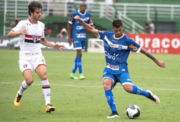 Aos oito minutos, a primeira grande chance. Escanteio cobrado, Lucas saiu ‘caçando borboleta’ e a bola bateu na cabeça de Ganso e, em cima da linha, Felipe Saturnino tirou. O Azulão respondeu aos 15, com chute de fora da área de Jean Patrick, que resvalou em Rodrigo Caio e saiu, passando perto da trave de Denis.