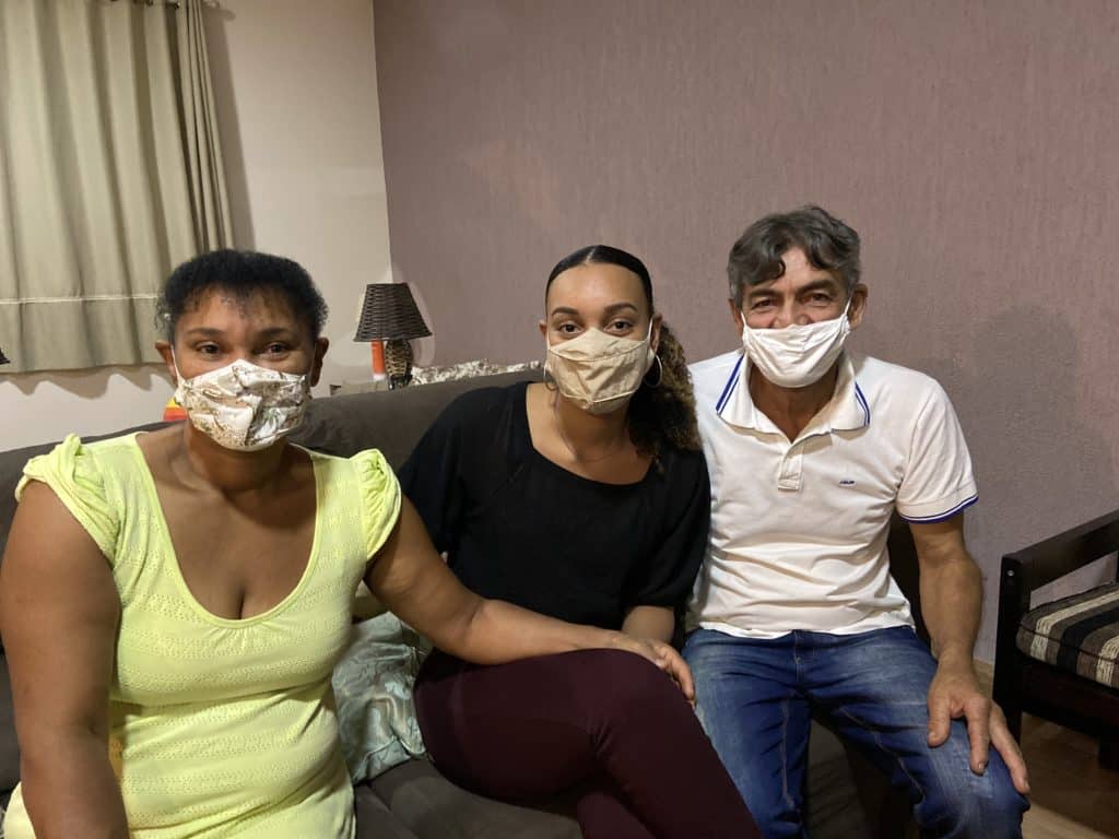 Camila com os pais Marco e Marinalva Fernandes de Souza Oliveira na sala de casa, no Novo Wenzel