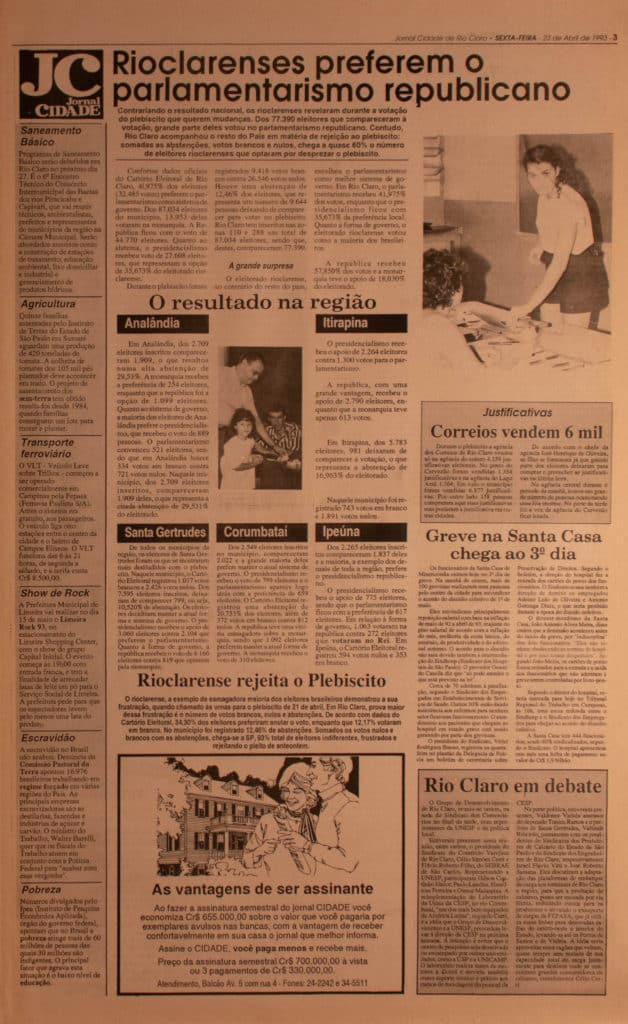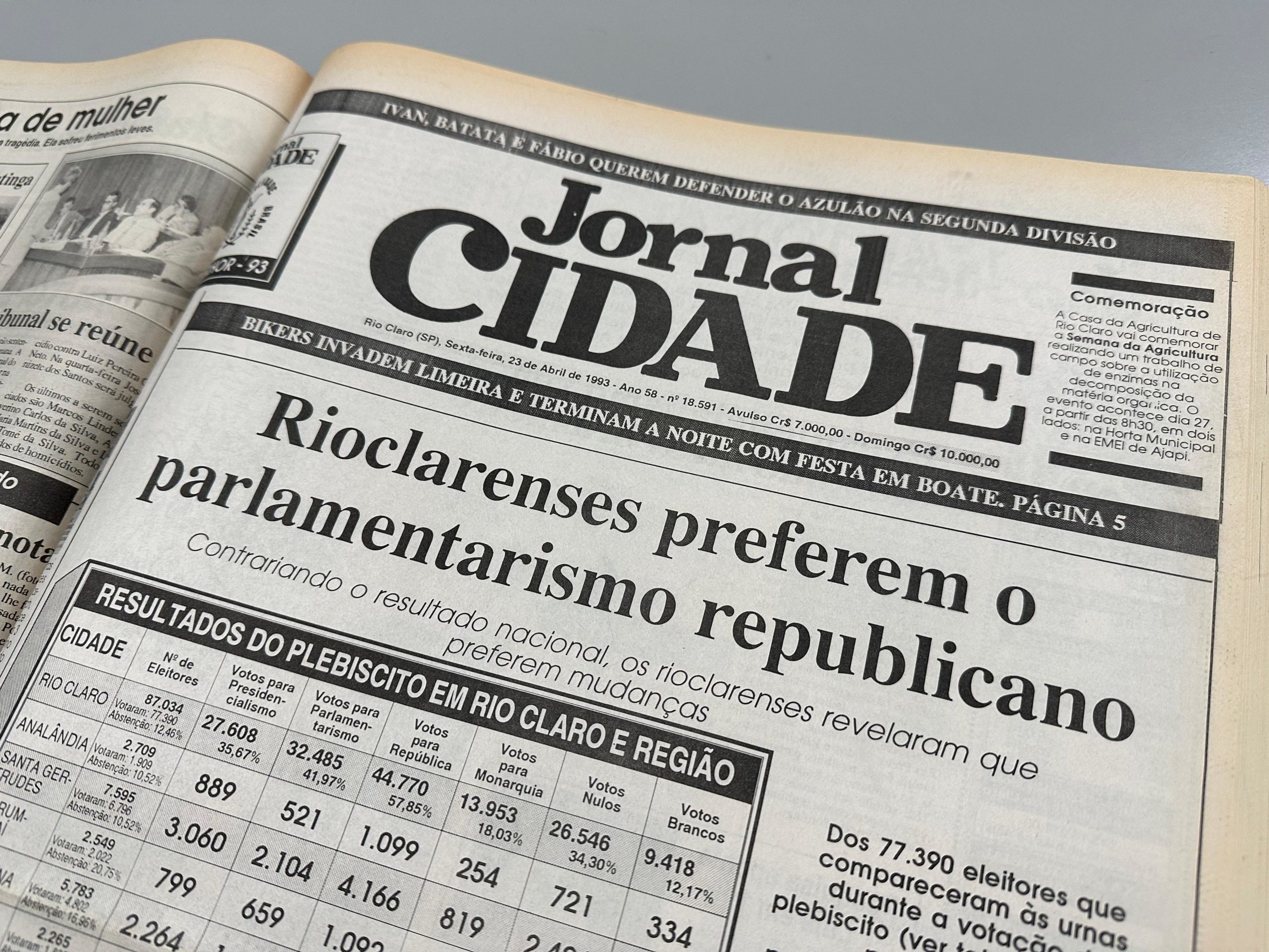 Jornal Cidade trouxe ampla reportagem, três décadas atrás, sobre o resultado do plebiscito sobre o sistema e forma de governo no Brasil. Resultado em Rio Claro foi diferente do nacional, já que aqui se sobressaiu pedido por parlamentarismo republicano