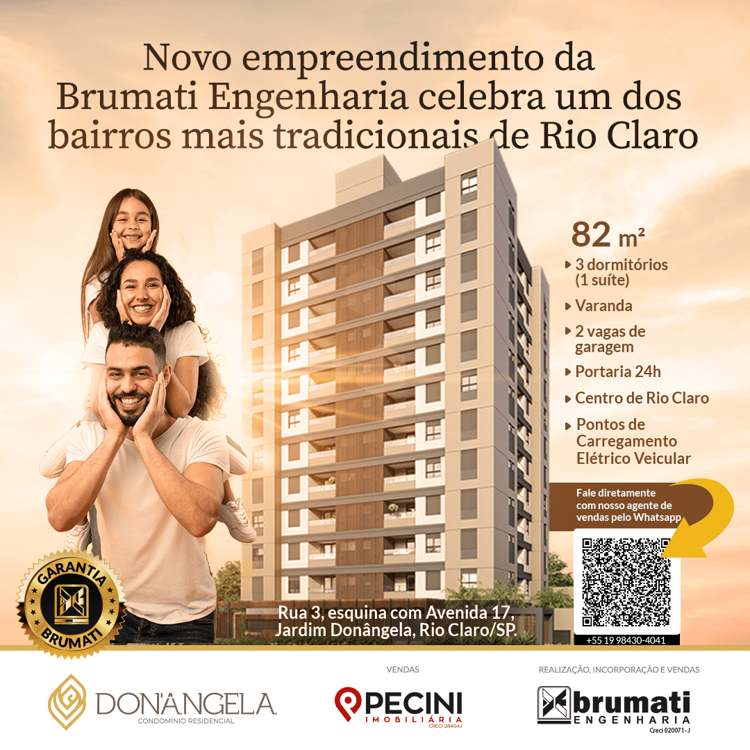 Com um projeto que une o clássico e o contemporâneo, o Condomínio Residencial Don’Ângela é um condomínio fechado em torre única, com 44 apartamentos de 82m², 3 dormitórios (sendo 1 suíte), cozinha americana, varanda, 2 vagas de garagem e área comum com academia, salão de festas, espaço coworking e até pontos de carregamento elétrico veicular. “Além de todos os diferenciais, o projeto arquitetônico desse empreendimento também é único na cidade, e segue uma tendência que hoje é vista em grandes capitais como São Paulo”, comenta o eng. Luis Carlos Brumati. “Com um lançamento desse porte, a Brumati Engenharia estabelece um padrão de qualidade e design que aponta a direção a ser seguida por tudo o que vier a se instalar nessa região, proporcionando valorização e modernização não apenas para o bairro, mas para todo o centro de Rio Claro”, finaliza.