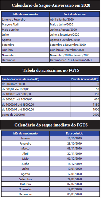 A opção cadastrada nos sistemas da CAIXA até dezembro de 2019 surtirá efeito a partir do dia 1º de janeiro de 2020. Desta data em diante a opção registrada pelo trabalhador passa a ter efeito imediato e pode ser realizada a qualquer tempo (Confira calendário abaixo). A partir de 2021, a liberação ocorrerá no mês de aniversário do trabalhador.