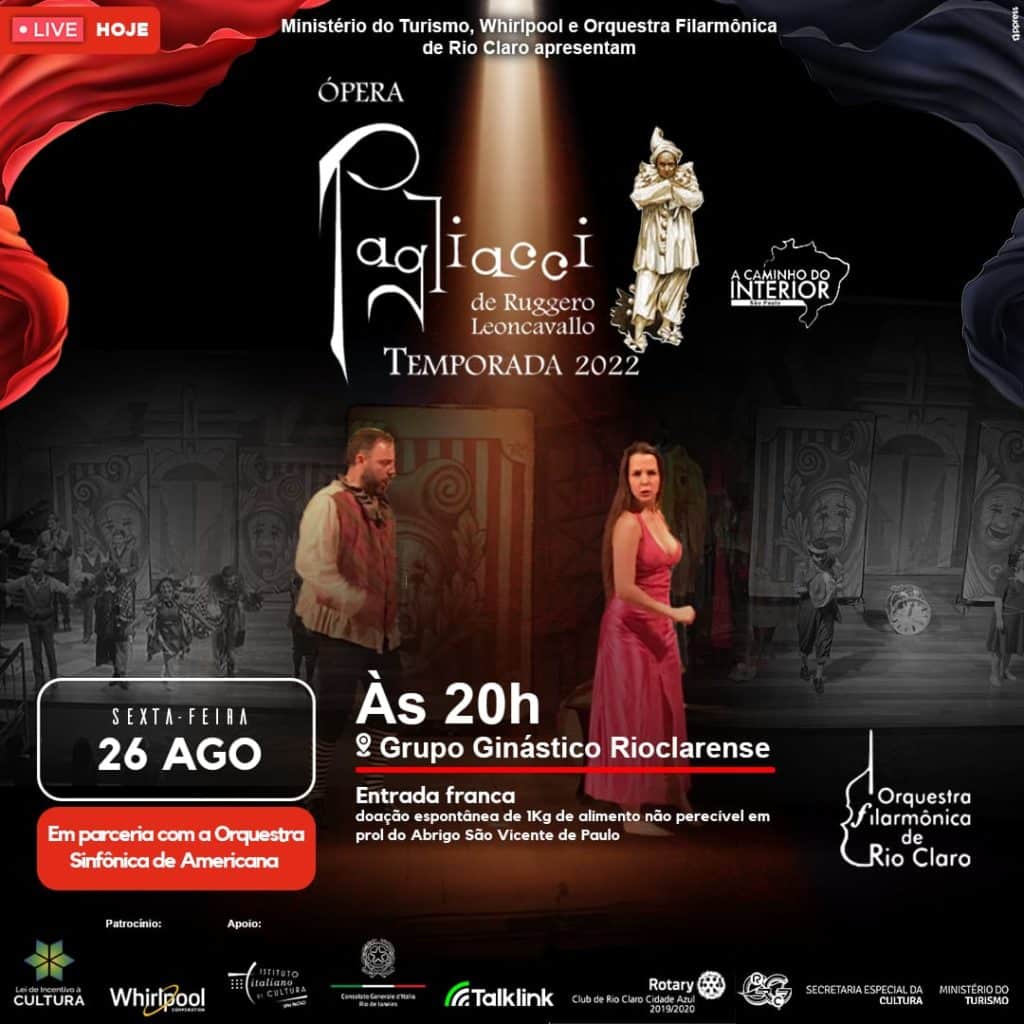 Acontece hoje no Grupo Ginástico, às 20h, a encenação completa da Ópera Pagliacci, de Ruggero Leoncavallo, com a Orquestra Filarmônica de Rio Claro e Orquestra Sinfônica de Americana.