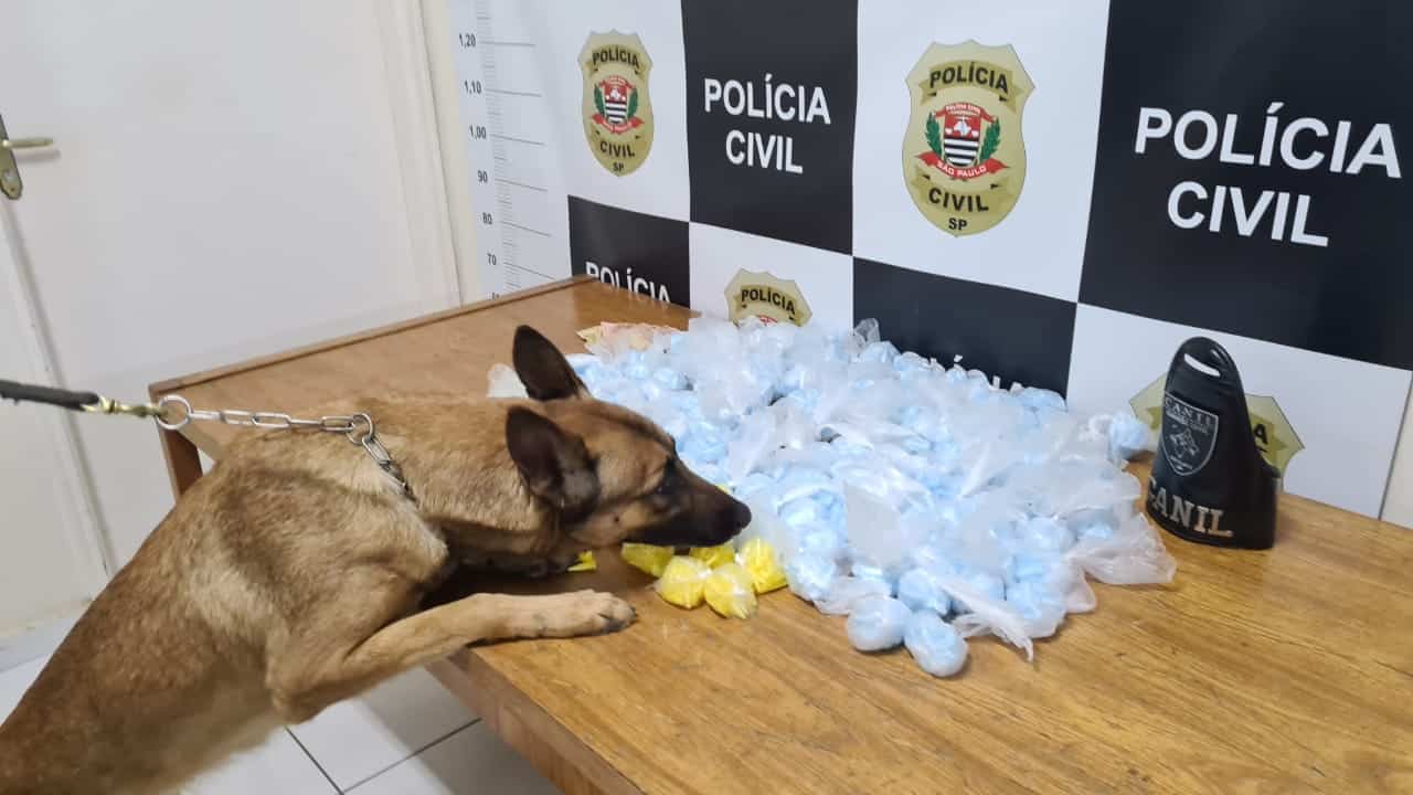 Policiais que atuam na Delegacia de Investigações Sobre Entorpecentes (DISE) contaram com o apoio de policiais da Central de Polícia Judiciária (CPJ), da Delegacia de Defesa da Mulher (DDM) e também de guardas civis municipais que levaram a cadela de faro Madona para auxiliar nas buscas aos entorpecentes.