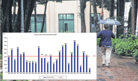 Os dados apontam ainda que os cinco primeiros meses deste ano também registraram chuvas abaixo da média esperada para cada mês. Em janeiro, a média aguardada era de 289,7mm, mas caíram 250,8mm. Em fevereiro, esperavam-se 217,3mm, mas foram registrados em Rio Claro 198,9mm. No mês seguinte, em março, a média seria de 149,5mm, mas a chuva foi de 105,3mm no período. Em abril, dos 78,6mm esperados registraram-se apenas 11,6mm na cidade. E em maio, de 60,9mm aguardados, a chuva registrada em todo mês foi de apenas 28,9mm.