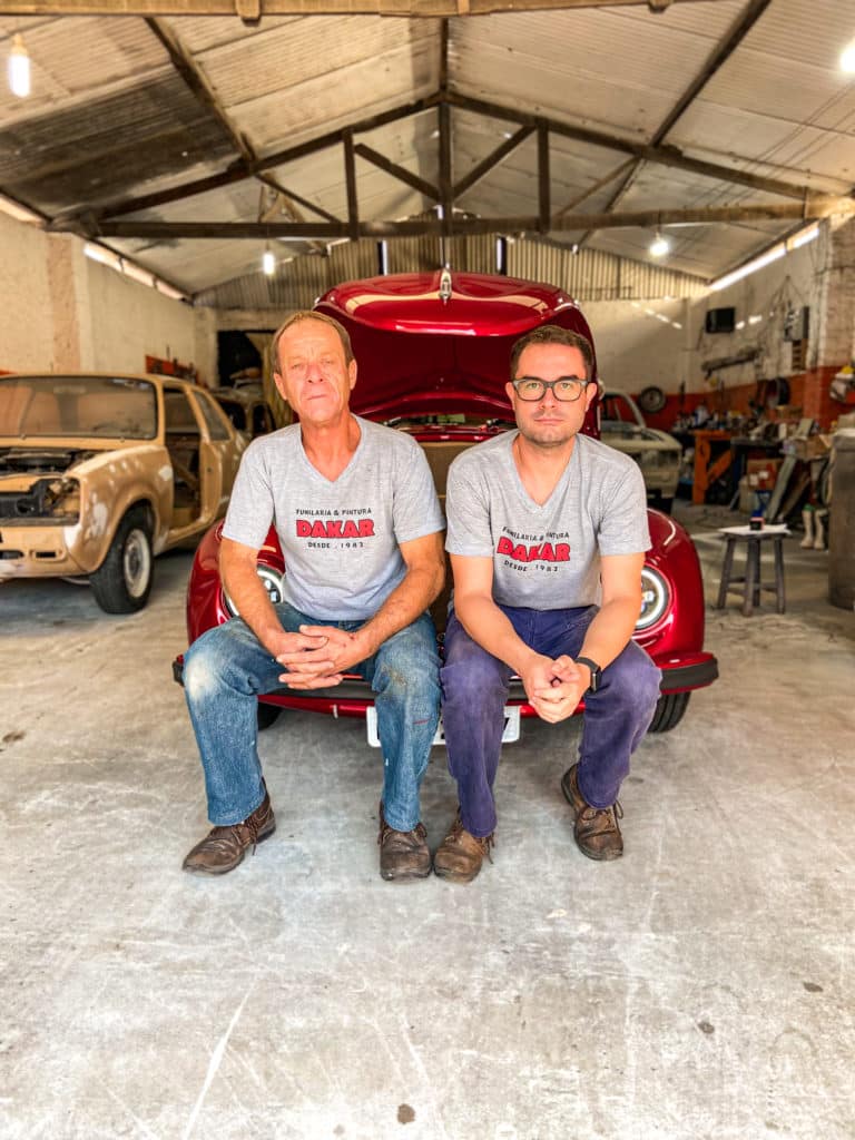 Entre os muitos exemplares em que  já trabalharam, pai e filho restauraram um VW Fusca, 1973, vermelho. O trabalho envolveu a funilaria, pintura, parte elétrica, mecânica e tapeçaria. O projeto levou um ano e seis meses para ficar pronto.