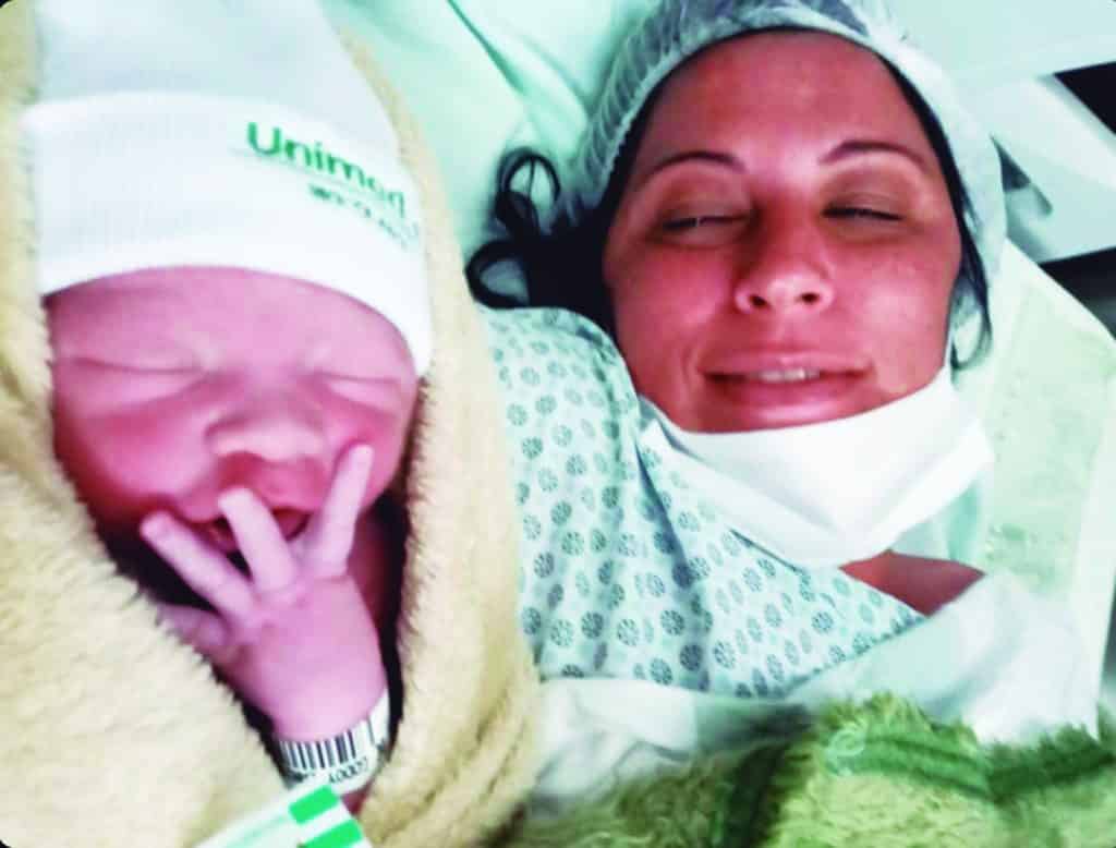 Foto mostra o bebê junto com a mãe Adriana logo após o parto.