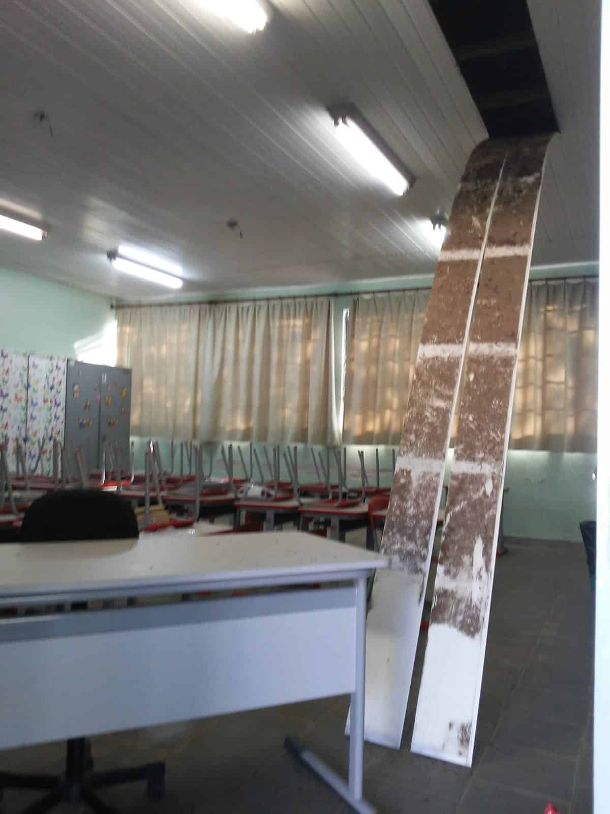 Conforme registrado em imagens, parte do forro de salas e do refeitório caiu; a quadra e o parquinho estão em completo abandono; a limpeza da área não está sendo realizada; a geladeira e os vidros das janelas da cozinhas estão quebrados e o fogão está sem condições de uso; as lousas das salas estão escoradas por cadeiras e mesas, entre outros problemas.