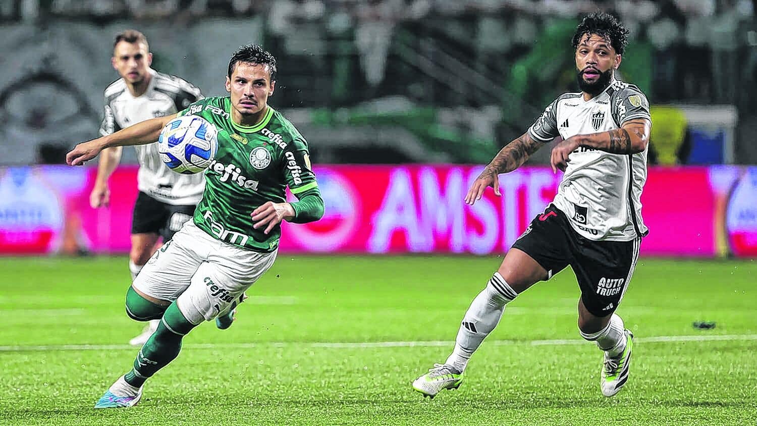 O jogador Raphael Veiga, da SE Palmeiras, disputa bola com o jogador do C Atlético Mineiro, durante partida válida pela oitava de final, volta, da Copa Libertadores, na arena Allianz Parque. (Foto: Cesar Greco/Palmeiras/by Canon)