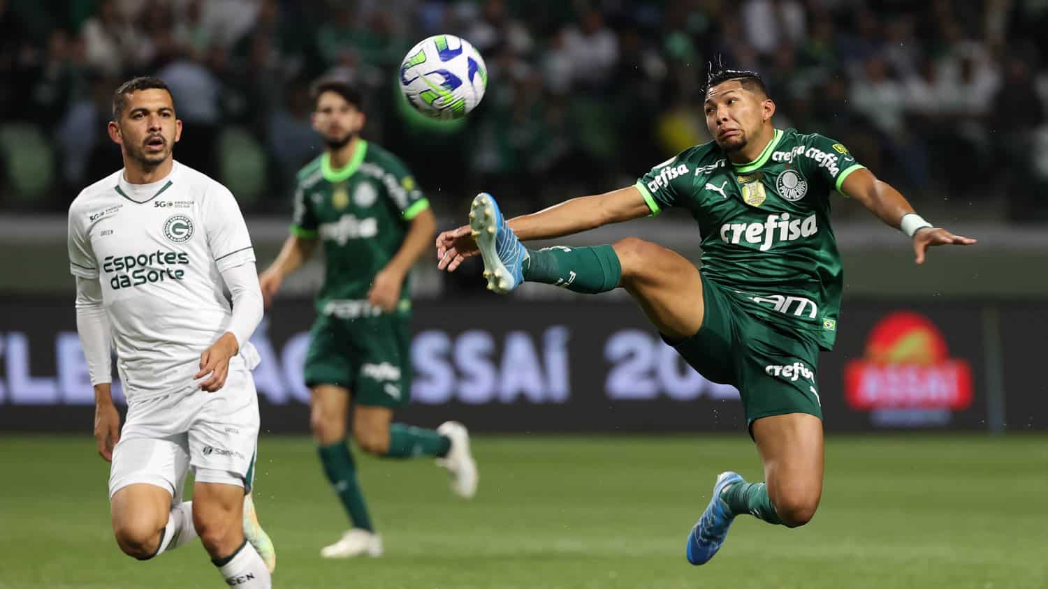 O jogador Rony, da SE Palmeiras, disputa bola com o jogador do Goiás EC, durante partida válida pela vigésima terceira rodada, do Campeonato Brasileiro, Série A, na arena Allianz Parque. (Foto: Cesar Greco/Palmeiras/by Canon)