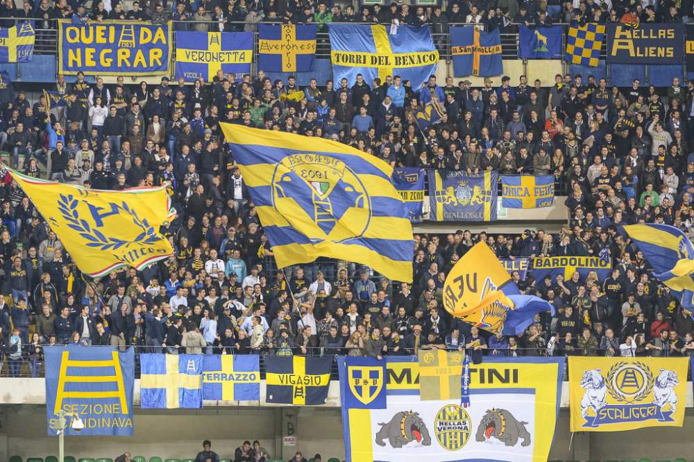 Torcida do Hellas Verona no estádio Marcantonio Bentegodi, fundado em 1963 com capacidade para aproximadamente 39.400 pessoas.