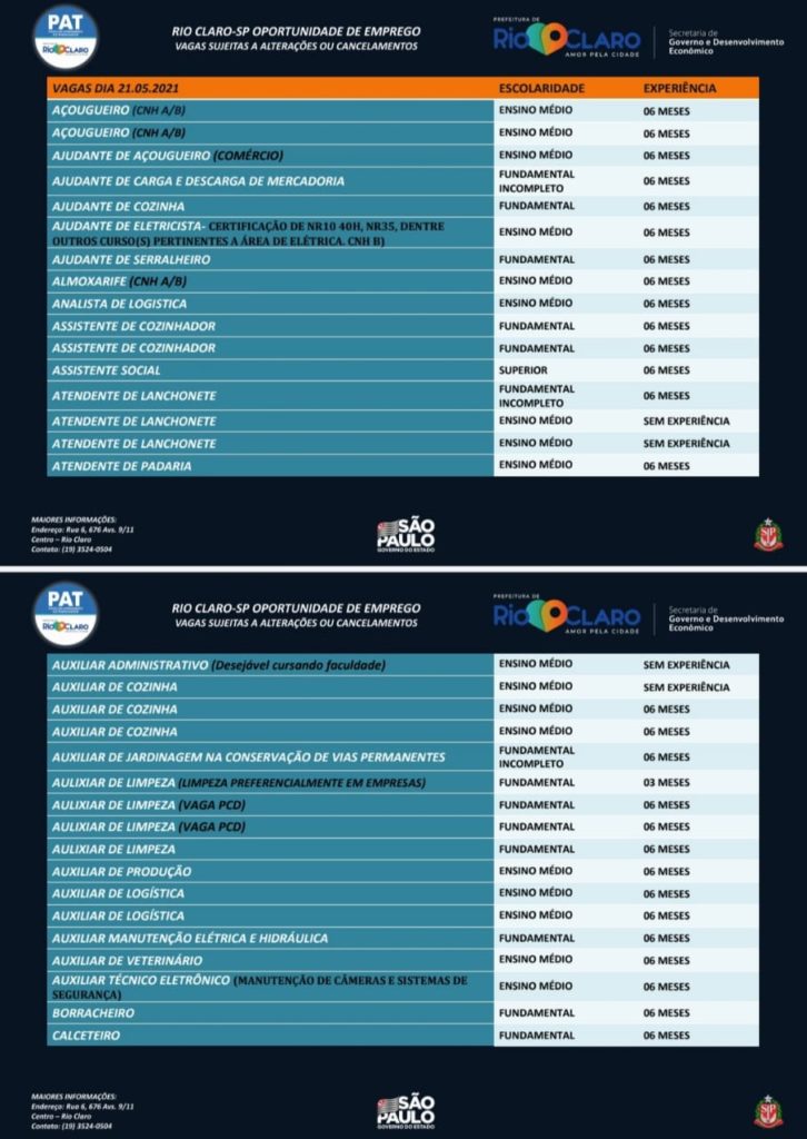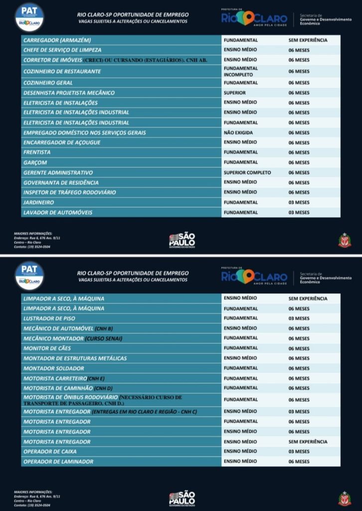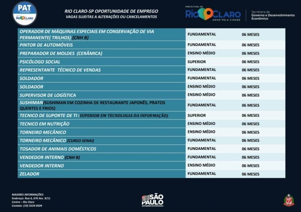 O Posto de Atendimento ao Trabalhador (PAT) de Rio Claro divulgou oportunidades de trabalho atualizadas para esta sexta-feira (21). Confira e boa sorte!