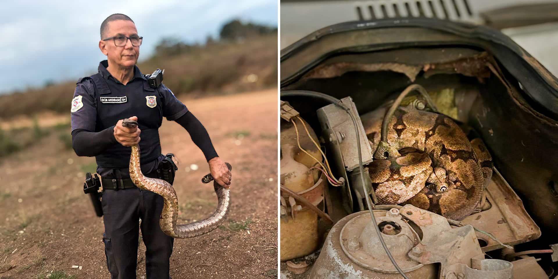 No local, os agentes encontraram um Fiat Uno no quintal da residência indicada pela moradora. Ao inspecionar o veículo, a equipe localizou uma cobra jiboia de aproximadamente 1,20 metro, que estava em boas condições de saúde, sem lesões aparentes. Essa espécie é classificada como não peçonhenta, embora sua mordida possa ser dolorosa e causar infecções.