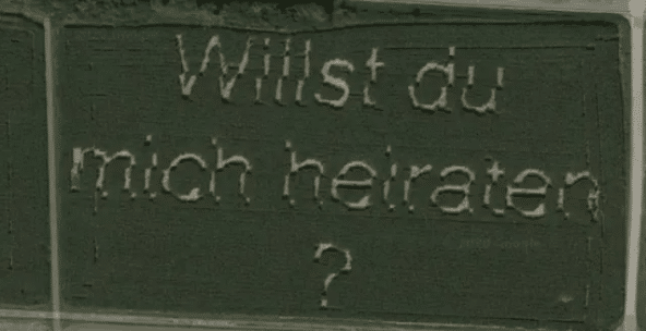 Um pedido de casamento criativo acabou aparecendo no Google Maps. Tudo começou quando o agricultor Steffen Schwarz usou uma plantação de milho para formar a frase “você quer casar comigo?”, na cidade de Hüttenberg, na Alemanha.