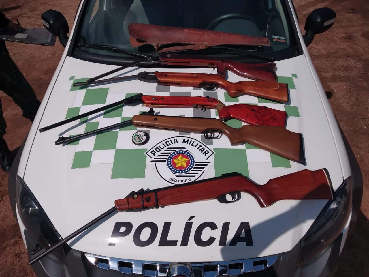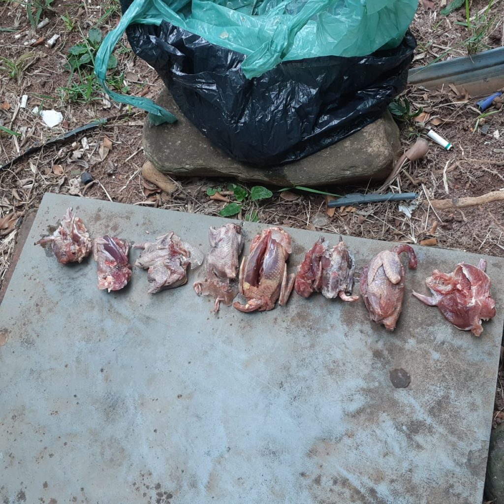 No referido local foi realizado contato com o dono da residência e localizado 5 armas de pressão, calibre 5.5, das quais 1 arma estava adulterada para arma de fogo calibre .22, um recipiente contendo munições de chumbinho, um cartucho deflagrado de munição calibre .22 e 3 munições intactas calibre .22 que eram utilizados para o abate de animais silvestres; além de um saco contendo 8 aves silvestres abatidas, sendo pomba-amargoza, prontas para consulmo e 9 aves silvestres mantidas irregularmente em cativeiro.