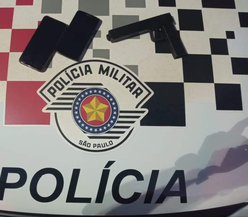 Durante a varredura nas proximidades, foram localizados um simulacro de arma de fogo tipo pistola, utilizado para o cometimento do roubo, e o celular da vítima. Os adolescentes foram conduzidos ao Plantão Policial permanecendo à disposição da Justiça
