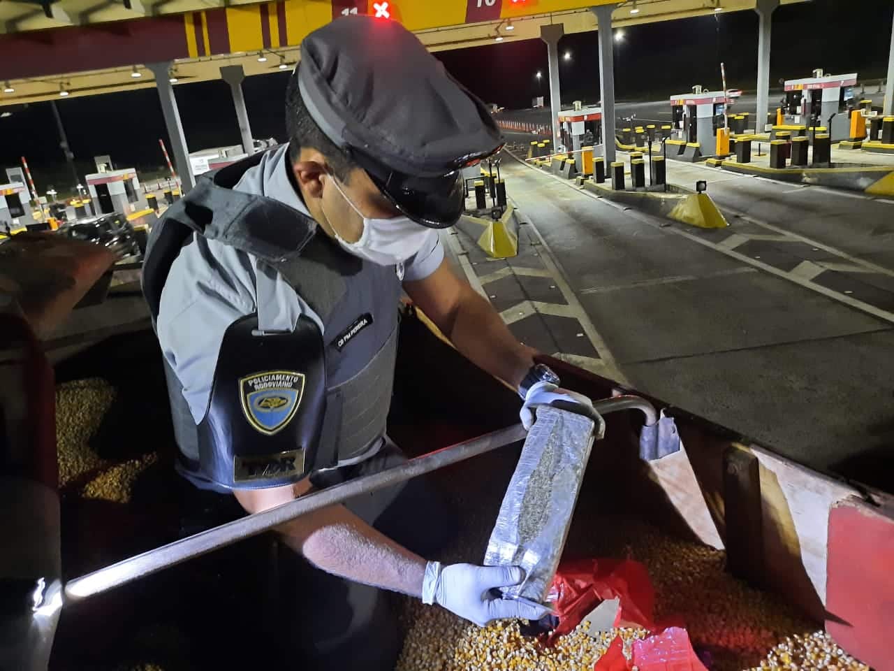 Foi feita abordagem e, durante vistoria no veículo, em meio a carga de milho a granel, foi encontrada grande quantidade de droga acondicionadas em caixas plásticas. Ao todo, foram recolhidos mais de 8.236 quilos de maconha, que foram encaminhados para perícia.