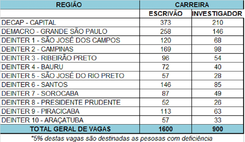 A Polícia Civil lançou, neste sábado (19), dois editais para a contratação 2,5 mil policiais que irão atuar em todas as regiões do Estado. Serão ofertadas 1,6 mil vagas para a carreira de escrivão de polícia e 900 para investigadores. As inscrições estarão abertas a partir das 10h do próximo dia 3 até às 23h59 de 1 de abril e terão que ser realizadas, exclusivamente, pelo site da Fundação Vunesp. O valor da taxa é de R$ 105,50.