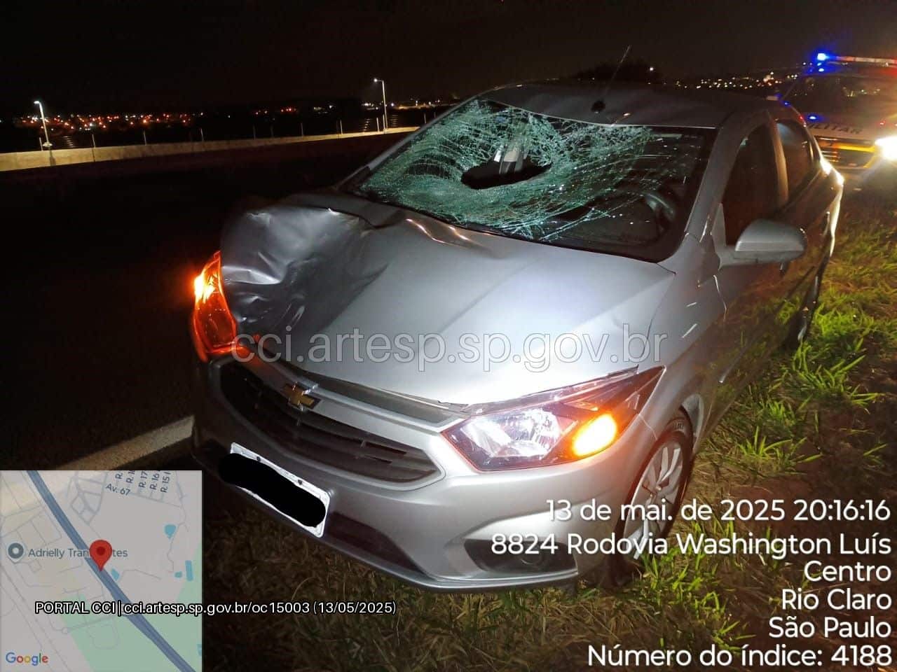 Segundo informações preliminares, o homem atravessava a rodovia a pé, no sentido centro-bairro, quando foi atingido por um veículo. O carro, que apresentava danos na dianteira e no parabrisa (foto abaixo), permaneceu no local, e o motorista colaborou com as investigações. A Polícia Militar Rodoviária e a perícia técnica estiveram no local para os procedimentos.