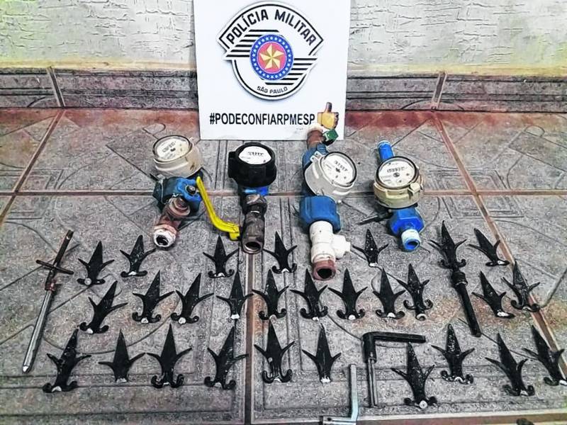Com ele foram encontrados quatro relógios medidores de água e 28 lanças de ponta de portão. Diante do flagrante, o indivíduo acabou confessando o crime e ainda indicou mais um local em que teria cometido o crime.