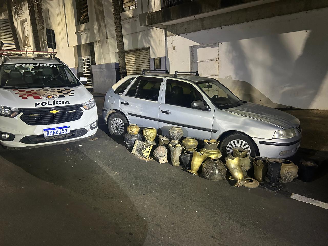 Quatro suspeitos foram flagrados removendo 24 jarros de metal; veículo e celular foram apreendidos durante a ação policial