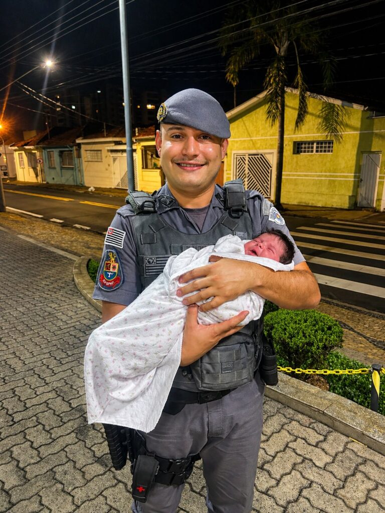 Momento de carinho: a recém-nascida é segurada pelo policial militar do 37º BPM/I, autor do salvamento e parente da criança. O ato heroico foi crucial para restabelecer a respiração do bebê antes do transporte para o hospital em Rio Claro. Foto: Divulgação / 37º BPM/I