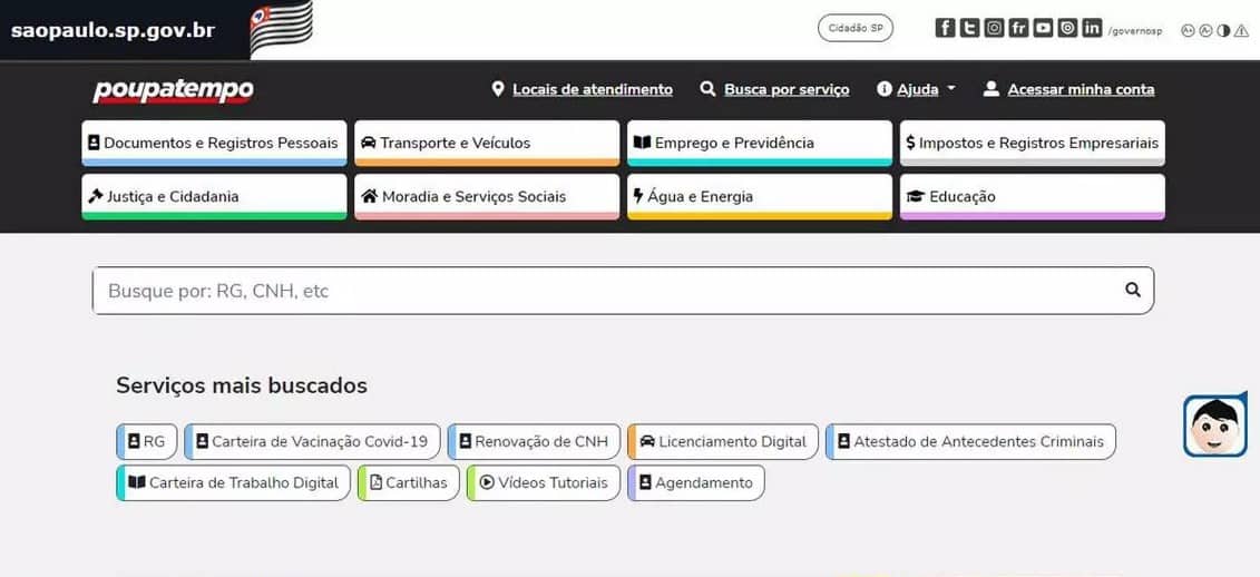 Na sequência, a página inicial destaca a área de busca, onde o cidadão pode digitar o atendimento que deseja e ser levado para a tela específica. Logo abaixo, estão as principais opções requeridas no Poupatempo, como RG, renovação de CNH, acesso à carteira digital de vacinação contra a Covid-19, entre outras.