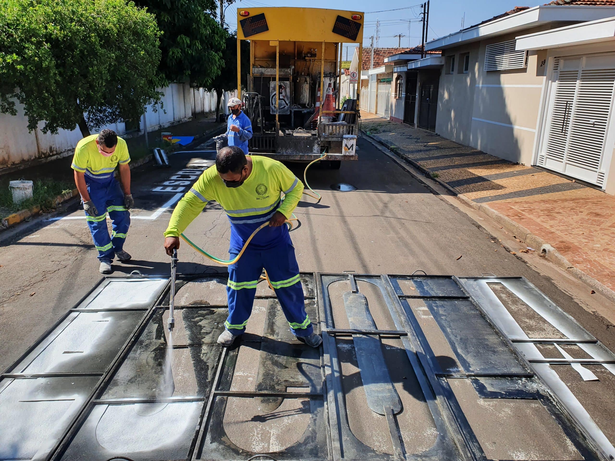 Na Rua 17 entre as avenidas 23 e 25, em frente ao projeto educacional da Escola Diva Marques Gouvêa, foram pintadas vagas de estacionamento para transporte escolar e para pessoa com deficiência, e faixa de pedestre.