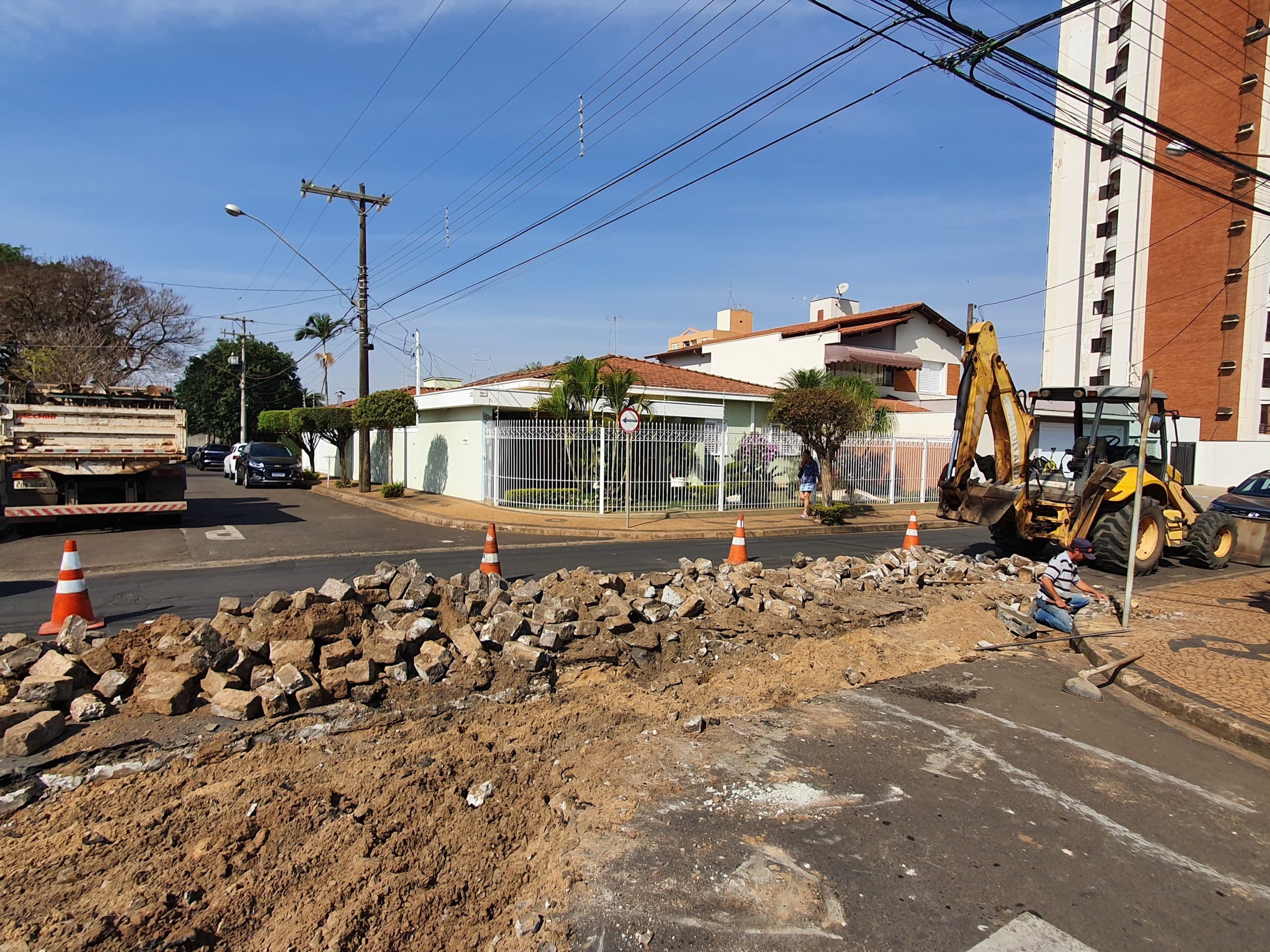 A prefeitura de Rio Claro está colocando valeta na Rua 1, esquina com a Avenida 23, no bairro Cidade Jardim. Como vem sendo feito em várias regiões da cidade, trata-se de valeta menos profunda, que permite o escoamento da água sem atrapalhar o fluxo de veículos.