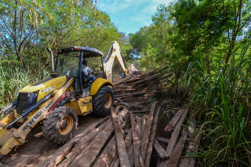 A obra está sendo feita com apoio de empresas. A ação está sendo realizada pela secretaria municipal de Obras. Os serviços incluem a troca de três “linhões” da ponte, uma de 16 metros e duas de nove metros. Além disso, todo o tablado está sendo trocado.