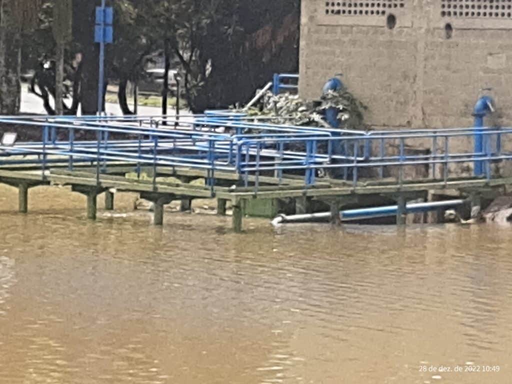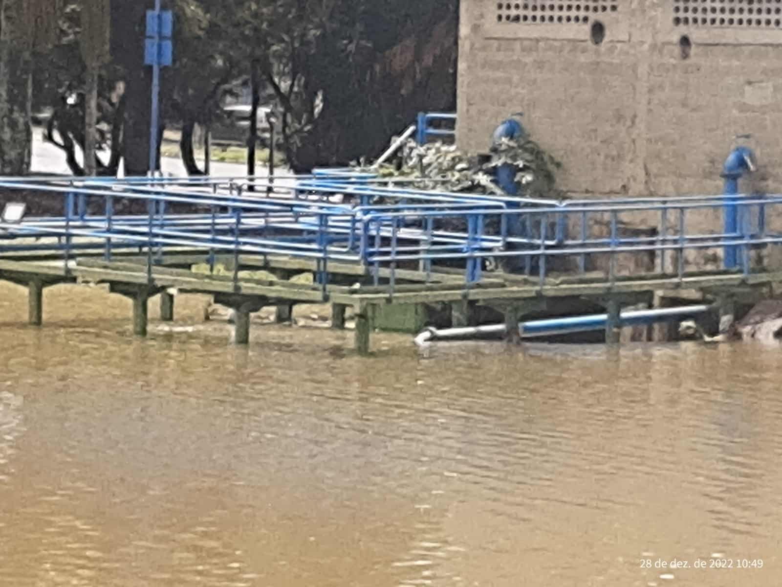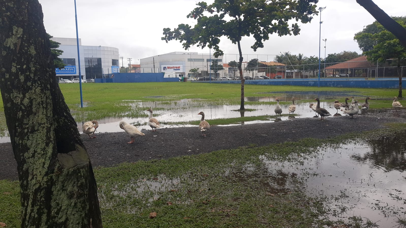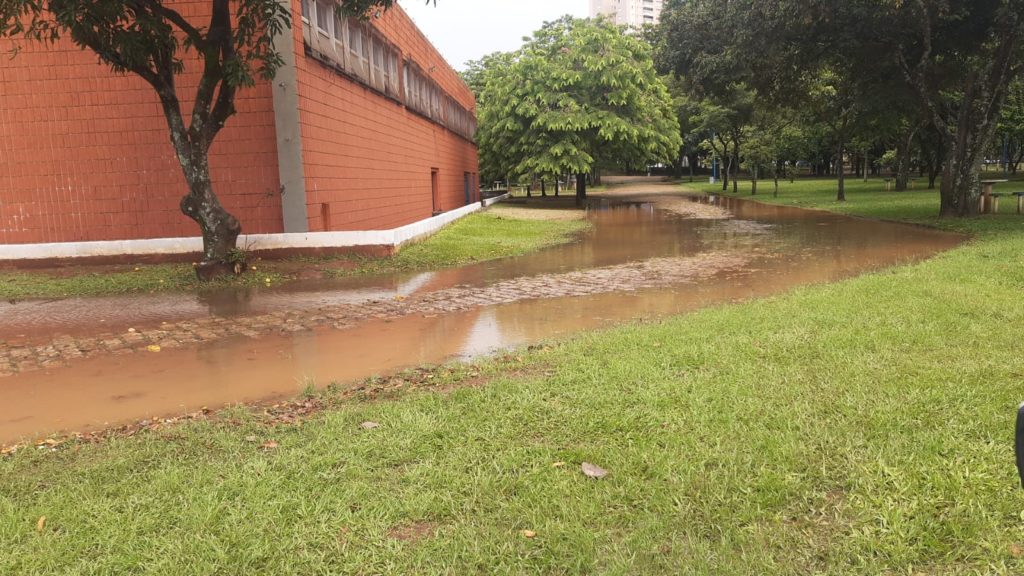 O lago está quase transbordando, com as águas chegando próximas ao limite suportado pela comporta localizada na Avenida 32. “Também interditamos o playground”, informa Ronald.
