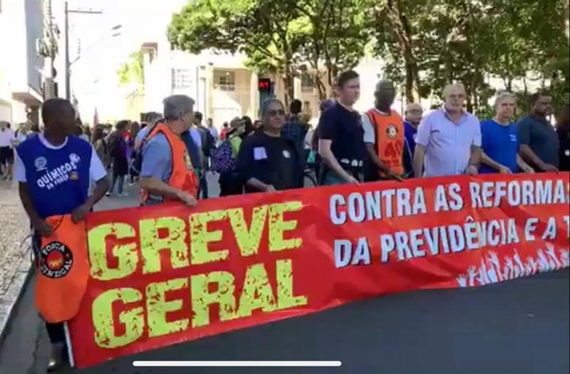 Grupos sindicais, estudantis e outros apoiadores realizam na manhã desta sexta (14), uma manifestação contra as reformas da previdência e trabalhista e também a terceirização.