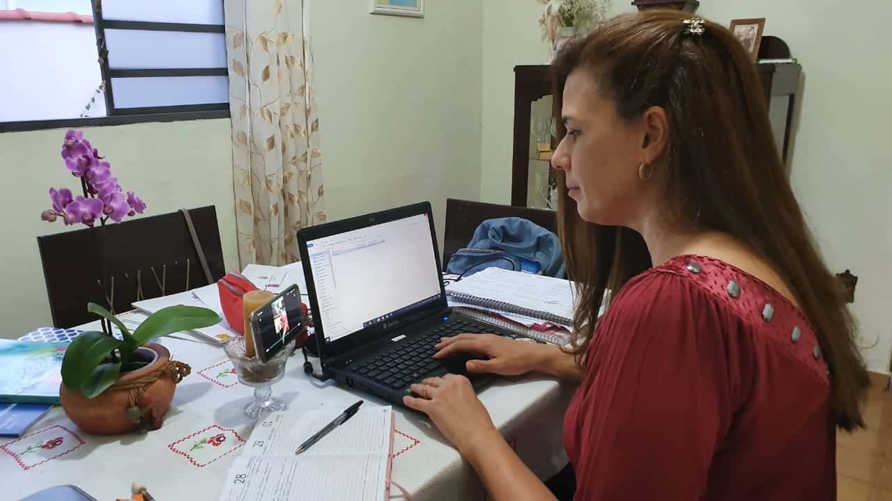 Já Glauce Timoni Góes Peleias dá aulas de ciências e orientação de estudo e tem como público-alvo adolescentes do 6º ao 9º ano da Escola Estadual Professora Carolina Augusta Seraphim: “O maior desafio é a devolutiva dos alunos, porque a escola em si se organizou bem e, quando o aluno não tem acesso à internet, a diretora leva na casa ou o pai vai buscar a parte escrita. Mas da maioria eu recebo a foto do caderno por WhatsApp e daí começa o trabalho de ver quem mandou, de quem eu preciso cobrar, as fotos às vezes vem desfocadas, cortadas”, diz Glauce.