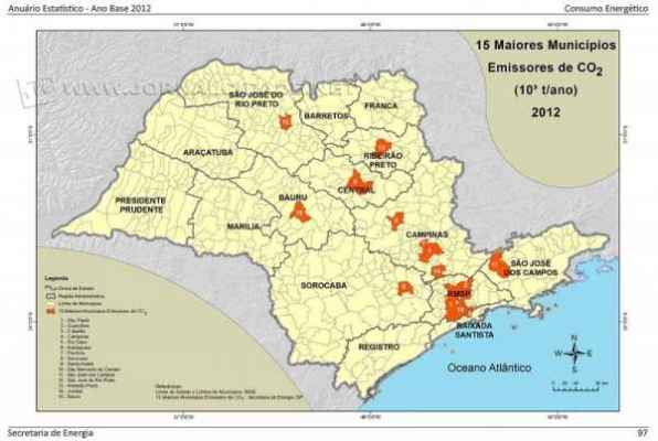 O primeiro lugar do estado é ocupado pela cidade de São Paulo, que responde por 16,7% da emissão de gás carbônico do estado. A capital paulista emite 14.473,44 10³ ton/ano. Em seguida vem Guarulhos com emissão de 6.745,37 10³ ton/ano, o que representa 7,8% do total de CO2 emitido pelo estado. Em terceiro lugar vem Cubatão com 4.303,17 10³ ton/ano ou 5%, Campinas com 2.418,64 10³ ton/ano ou 2,8% e Rio Claro com 2.190,00 10³ ton/ano ou 2,5%.
